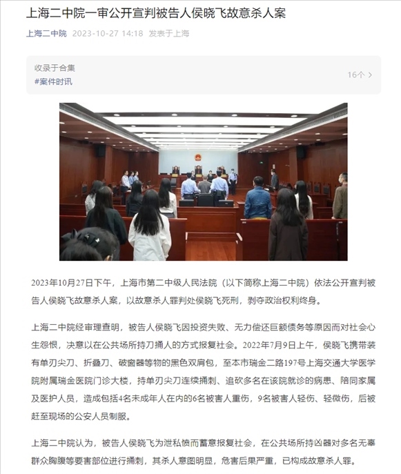 ·瑞金醫(yī)院門診大樓故意殺人案一審宣判:死刑,剝奪政治權(quán)利終身。