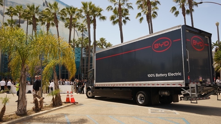 2022年5月10日,人們?cè)诿绹?guó)加利福尼亞州長(zhǎng)灘市舉行的2022年先進(jìn)清潔運(yùn)輸博覽會(huì)上參觀比亞迪展區(qū)。