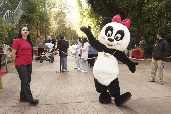 2月4日,在美國(guó)圣迭戈動(dòng)物園,一名裝扮成熊貓的工作人員在春節(jié)慶祝活動(dòng)上歡迎游客。