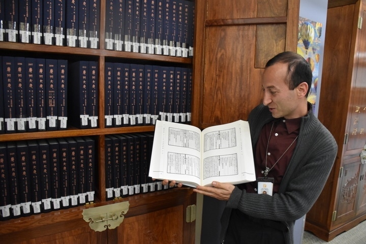 4月20日,一名圖書管理員在美國(guó)洛杉磯公共圖書館的中央圖書館展示《廣州大典》。