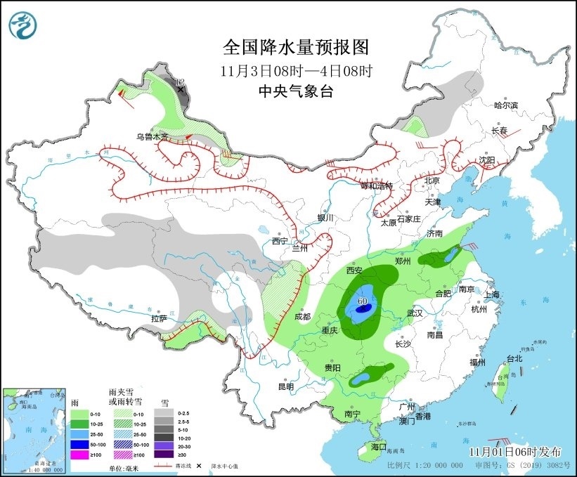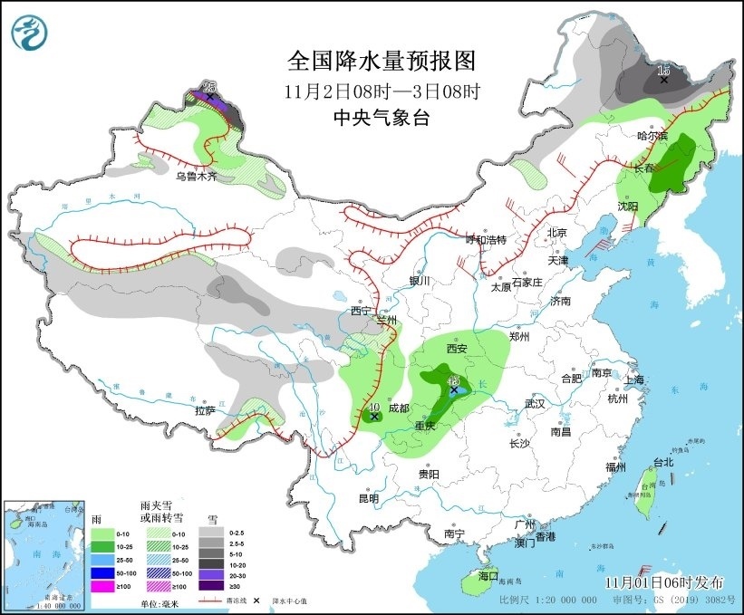 11月2日08時(shí)至3日08時(shí),內(nèi)蒙古東部、黑龍江中北部、新疆北部和南疆盆地南部、西藏北部和東部、青海南部、甘肅西南部等地部分地區(qū)有小到中雪或雨夾雪,其中,新疆阿勒泰北部、黑龍江西北部等地部分地區(qū)有大到暴雪,局地大暴雪(20~25毫米);黑龍江東部、吉林中東部、遼寧北部、陜西南部、四川中東部、重慶、貴州北部、湖北西部、河南西部、海南島、臺(tái)灣島等地部分地區(qū)有小到中雨,其中,四川中部、重慶東北部等地局地有大雨(25~45毫米)。內(nèi)蒙古中東部、吉林中部、遼寧東部、陜西北部等地部分地區(qū)有5~6級(jí)風(fēng)(見圖2)。