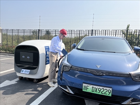 ?2023年10月17日,國網(wǎng)浙江電力工作人員在烏鎮(zhèn)使用首臺(tái)智能移動(dòng)充電機(jī)器人為新能源汽車充電。新華網(wǎng)發(fā) 沈佳煒 攝