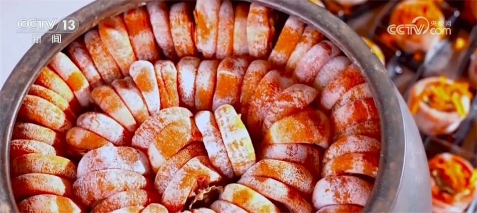 總臺記者 譚海梅:從削皮到吊掛到晾曬,這中間還得在經過三次的“捏心”,讓這里面的糖分能夠很好地釋放,從霜降一直到冬至,富平柿子才會成為口齒留香的柿餅。
