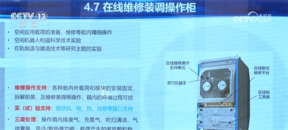 在中國空間站的艙內(nèi)艙外有大量的設備,這些設備一旦出現(xiàn)故障該怎么處理呢?我國科研人員創(chuàng)新性地研發(fā)了一套“在線維修裝調(diào)操作柜”,有了它,空間站的實驗設備和載荷一旦出現(xiàn)故障,就可以在軌進行維修。下面記者就帶我們一起來了解這個中國空間站的設備維修“利器”。