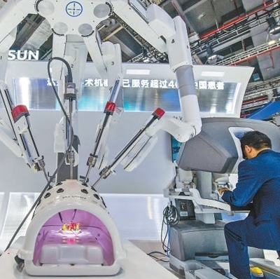 在醫(yī)療器械及醫(yī)藥保健展區(qū),參觀者正在體驗(yàn)操作復(fù)星醫(yī)藥首臺(tái)國(guó)產(chǎn)“達(dá)芬奇Xi手術(shù)系統(tǒng)”。人民網(wǎng)記者 翁奇羽攝