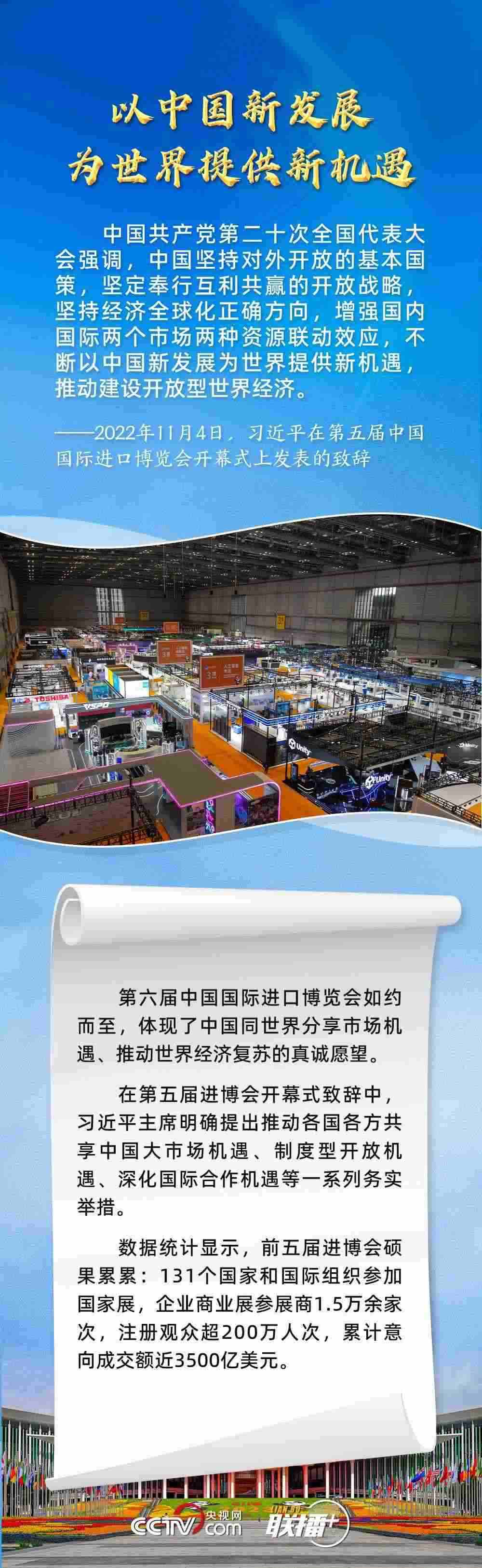 11月5日,第六屆中國國際進(jìn)口博覽會(huì)在上海開幕。習(xí)近平主席在致信中指出,2018年以來,進(jìn)博會(huì)成功舉辦五屆,依托中國大市場(chǎng)優(yōu)勢(shì),發(fā)揮國際采購、投資促進(jìn)、人文交流、開放合作平臺(tái)功能,對(duì)加快構(gòu)建新發(fā)展格局和推動(dòng)世界經(jīng)濟(jì)發(fā)展作出了積極貢獻(xiàn)。
