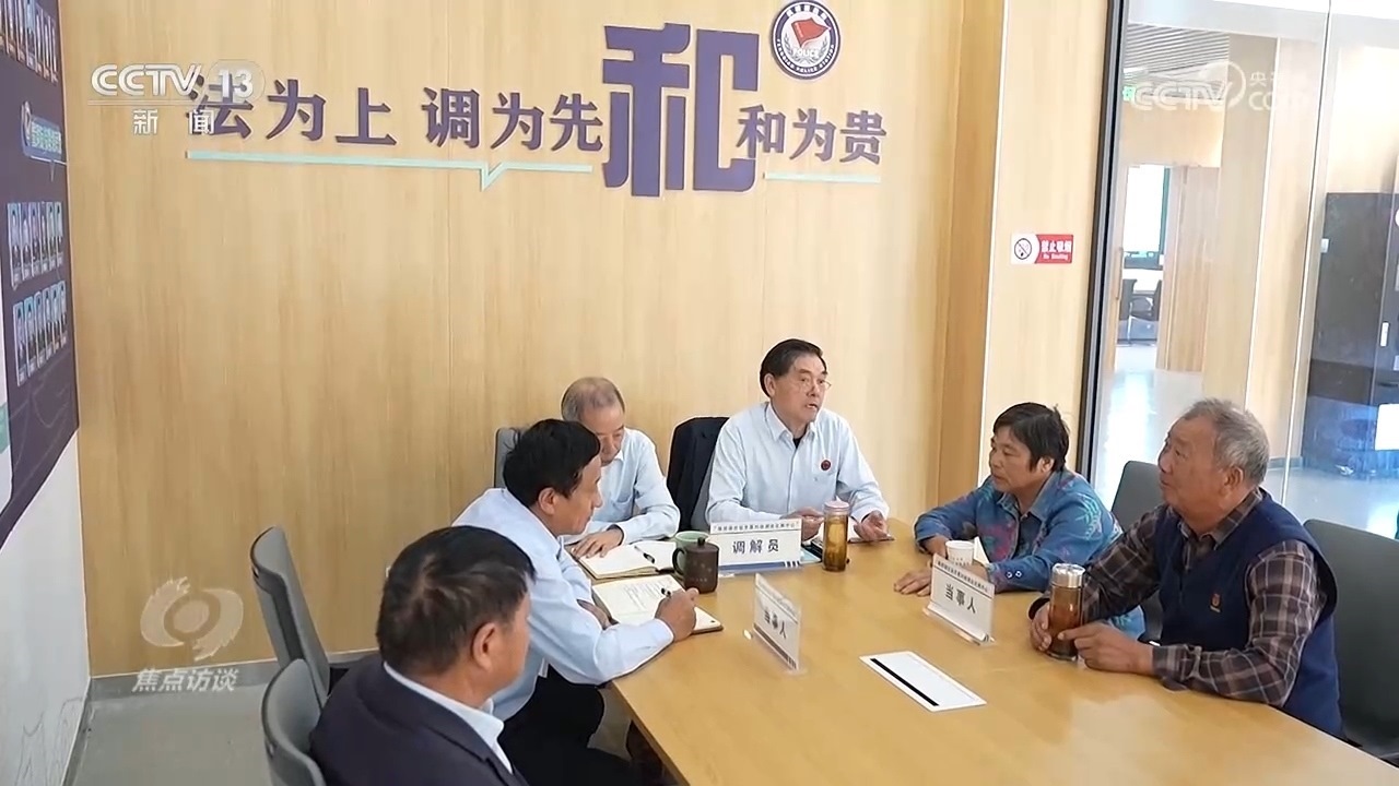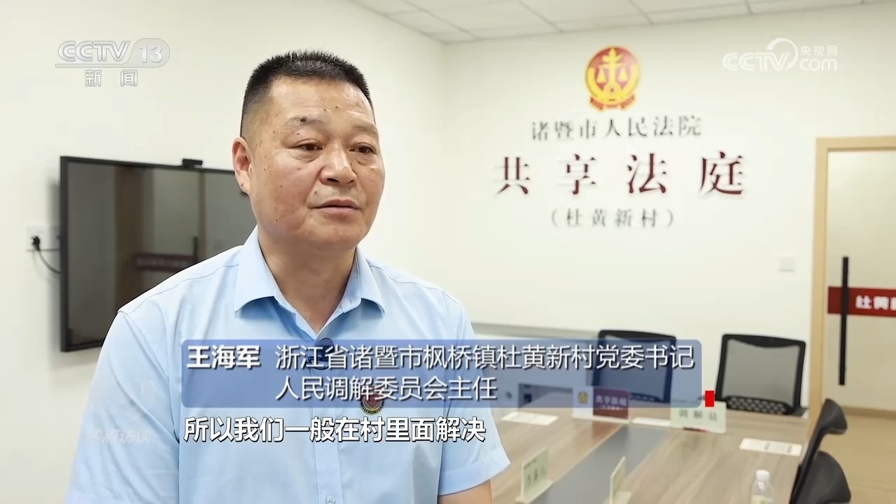 浙江省諸暨市楓橋鎮(zhèn)杜黃新村黨委書記、人民調(diào)解委員會主任王海軍:“村里一般的調(diào)解村兩委會以及村調(diào)委基本上就地解決,因?yàn)椤畻鳂蚪?jīng)驗(yàn)’矛盾不出村,所以我們一般在村里面解決。但是涉及到法律法規(guī)一塊或者有些老百姓在‘心結(jié)’上面解不開,我們就動用共享法庭。”