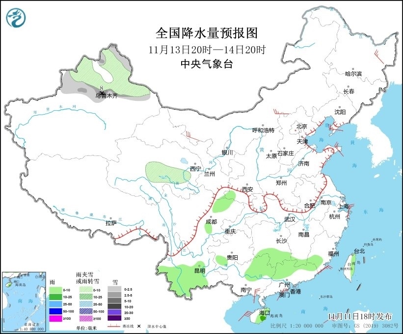 圖6 全國降水量預報圖(11月13日20時-14日20時)