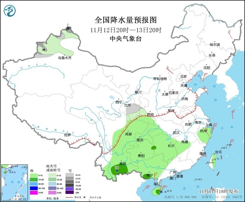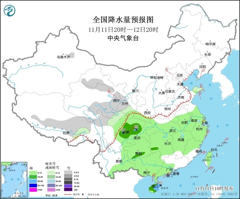 11月11日20時至12日20時,新疆沿天山地區(qū)、西藏中部和東部、青海北部和東南部、甘肅中南部和河西、山東半島、川西高原北部等地部分地區(qū)有小雪或雨夾雪。四川盆地、貴州南部、湖南西南部、海南島等地部分地區(qū)有中到大雨,局地有暴雨(50~65毫米)。遼東半島、青海北部、河北北部、山東半島、四川盆地中部、浙江東部等地部分地區(qū)有5~6級風。東海南部、臺灣海峽、臺灣以東洋面、巴士海峽、南海北部和中部、北部灣有7~8級、陣風9級的大風(見圖4)。