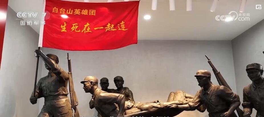 軍事記者 張喬普:在這個旅的旅史長廊,在我身旁的這些櫥窗,我看到了包括“生死在一起”連在內(nèi)的,一共17個英模單位的旗幟。這一面面鮮紅的戰(zhàn)旗,見證、記錄了這個旅代代官兵一路從抗日戰(zhàn)爭時期到抗美援朝浴血奮戰(zhàn)、英勇無畏的戰(zhàn)斗足跡。其中最引人注目的就是我身旁的這面“白臺山英雄團(tuán)”的戰(zhàn)旗。這面戰(zhàn)旗曾參加國慶70周年閱兵,在天安門廣場接受黨和人民的檢閱。而她的精神內(nèi)核,就是“生死在一起”。