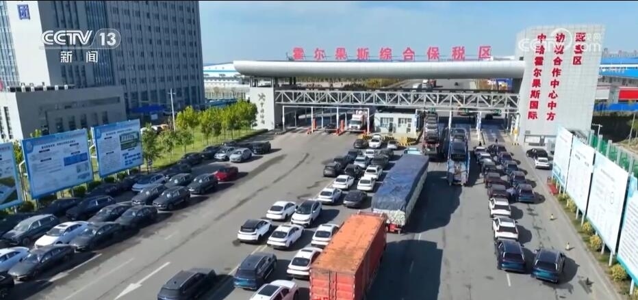 總臺(tái)記者 崔寧:看我的腳下,這邊是中國(guó)的土地,這邊是哈薩克斯坦的土地。人們?cè)谶@里可以一腳踏兩國(guó),自由地往來出入,不僅可以旅游購(gòu)物、貿(mào)易洽談,還能享受免稅政策。