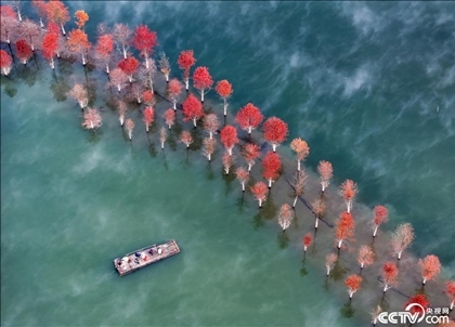 11月14日,初冬時(shí)節(jié),安徽省寧國(guó)市方塘鄉(xiāng)青龍灣濕地的紅杉林美如油畫(huà),游客乘坐竹筏在紅杉林中游覽觀光。
