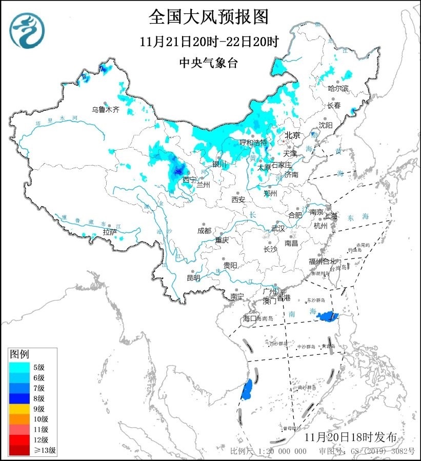 11月21日20時(shí)至22日20時(shí),新疆北部、內(nèi)蒙古大部、甘肅西北部、青海北部、寧夏北部、陜西北部、山西大部、河北西部、黑龍江西部、吉林東部等地部分地區(qū)將有5~6級、陣風(fēng)7~8級的大風(fēng);巴士海峽、南海中東部和西南部海域?qū)⒂?~8級、陣風(fēng)9級的大風(fēng)。
