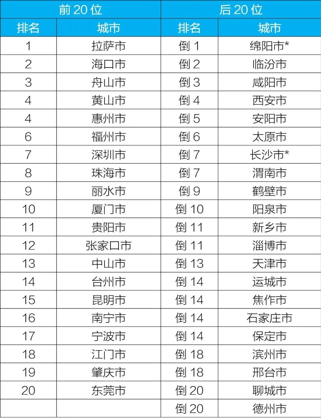1—10月,168個重點城市中,空氣質(zhì)量排名前20位城市依次是拉薩、??诤椭凵降瘸鞘校◤牡?名至第20名);空氣質(zhì)量排名后20位城市依次是綿陽、臨汾和咸陽等城市(從倒數(shù)第1名至并列倒數(shù)第20名)。其中,綿陽市科技城新區(qū)的高新區(qū)自來水公司站點4月和5月、長沙市開福區(qū)的伍家?guī)X站點6月受到嚴(yán)重人為干擾,對所在城市當(dāng)月六項污染物濃度進(jìn)行了最大值替代處理。見附表2。