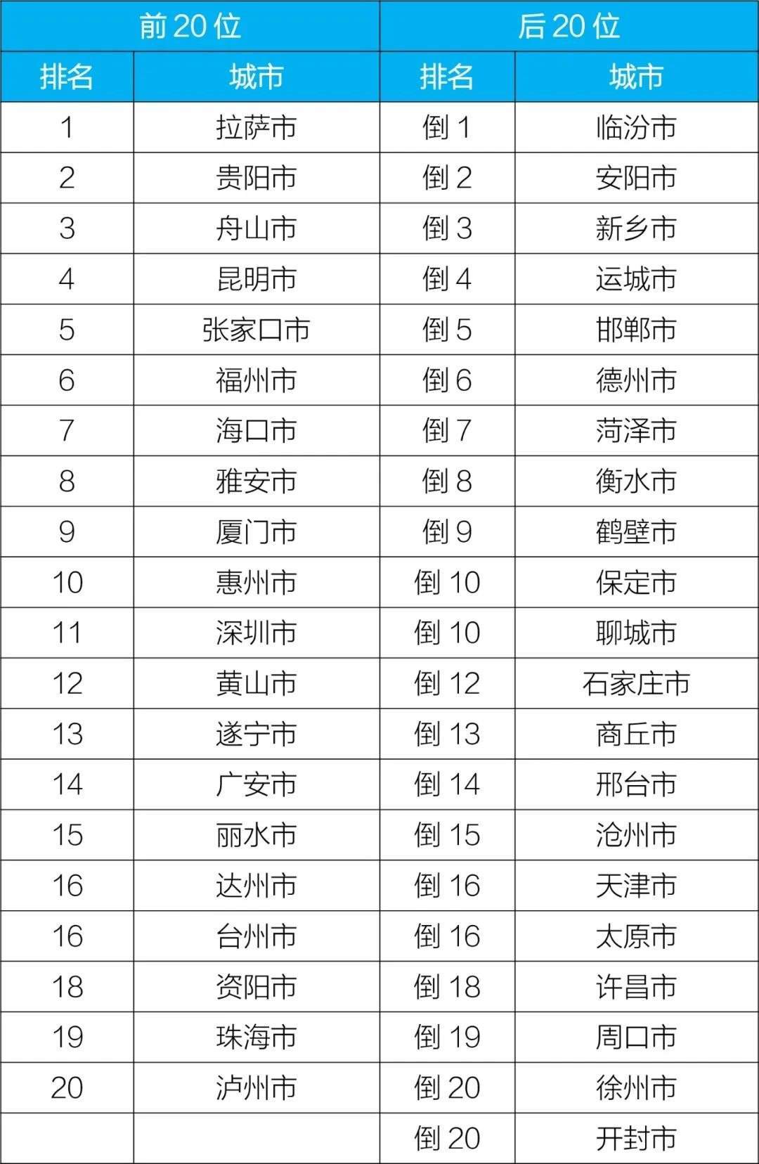 10月,168個重點城市中,空氣質(zhì)量排名前20位城市依次是拉薩、貴陽和舟山等城市(從第1名至第20名);空氣質(zhì)量排名后20位城市依次是臨汾、安陽和新鄉(xiāng)等城市(從倒數(shù)第1名至并列倒數(shù)第20名)。見附表1。