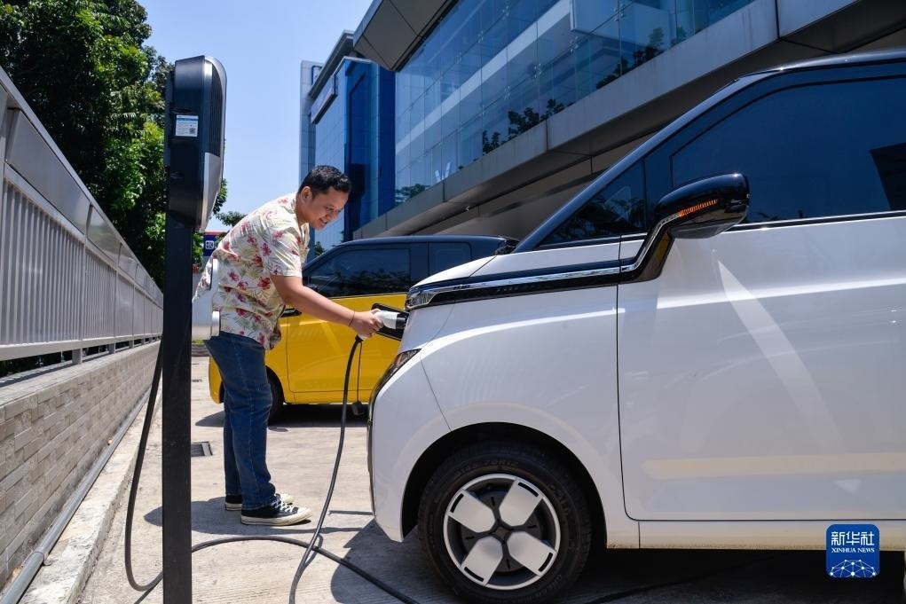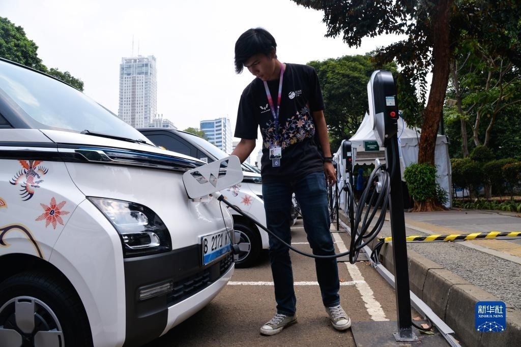 9月29日,在印度尼西亞雅加達一家商場的地下停車場,工作人員為一位五菱新能源車Air ev車主結(jié)束充電。新華社記者 徐欽 攝