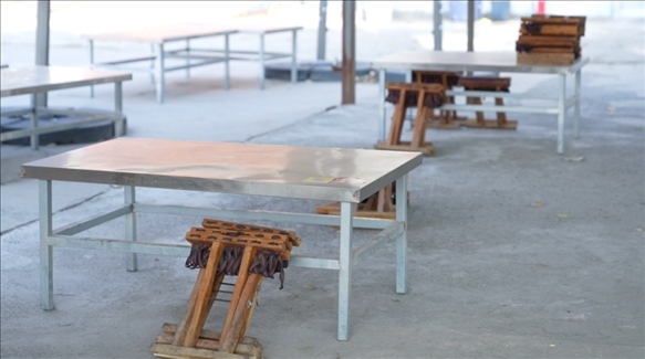 在一個(gè)汽車修理廠大院里,有一家露天燒烤店,夏天營業(yè),冬天停業(yè)。