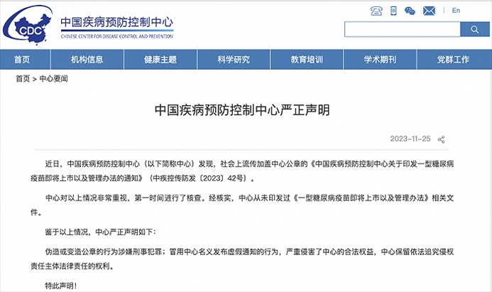 ·中疾控辟謠:從未印發(fā)過《一型糖尿病疫苗即將上市以及管理辦法》相關文件。