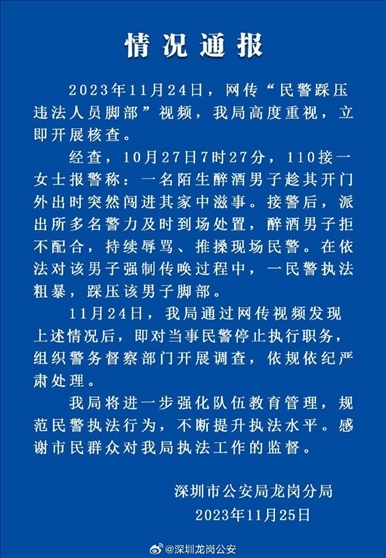 ·深圳龍崗警方通報“民警踩壓違法人員腳部”:依規(guī)依紀嚴肅處理。
