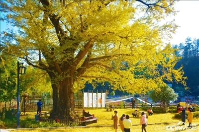 2023年11月25日,安徽安慶,響腸鎮(zhèn)請水寨村千年銀杏樹披“金甲”,進入最佳觀賞期,吸引游客前來游玩賞景。