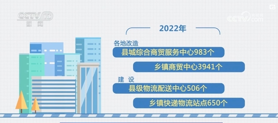 2022年,各地改造縣城綜合商貿(mào)服務(wù)中心983個(gè)、鄉(xiāng)鎮(zhèn)商貿(mào)中心3941個(gè),建設(shè)縣級(jí)物流配送中心506個(gè)、鄉(xiāng)鎮(zhèn)快遞物流站點(diǎn)650個(gè)。