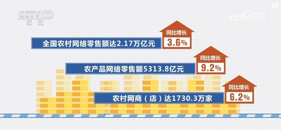 全國(guó)農(nóng)村網(wǎng)絡(luò)零售額達(dá)2.17萬(wàn)億元,同比增長(zhǎng)3.6%;農(nóng)產(chǎn)品網(wǎng)絡(luò)零售額5313.8億元,同比增長(zhǎng)9.2%;農(nóng)村網(wǎng)商(店)達(dá)1730.3萬(wàn)家,同比增長(zhǎng)6.2%。