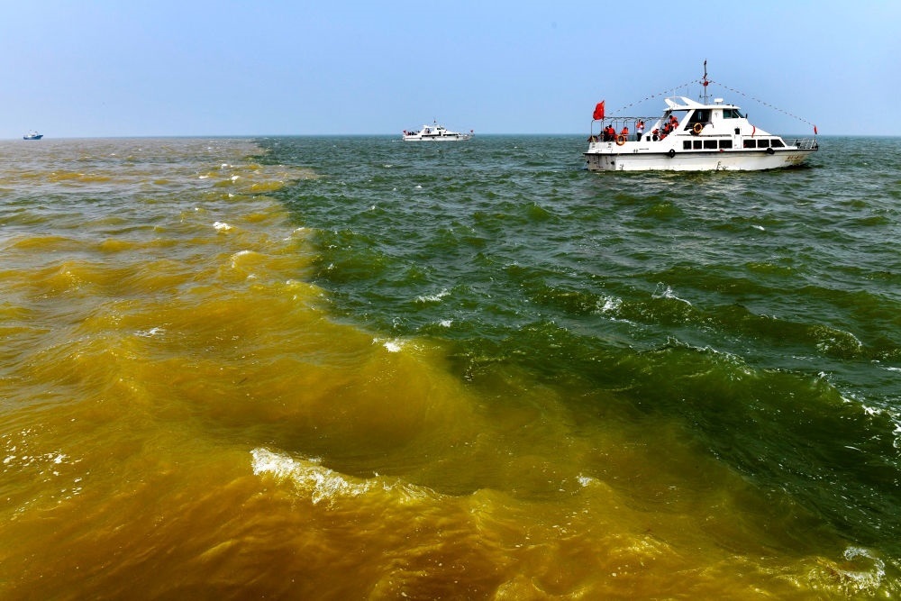 在山東省東營市黃河入???,黃河匯入渤海,形成獨特景觀(2021年5月13日攝)。