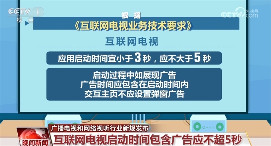 根據(jù)《互聯(lián)網(wǎng)電視業(yè)務(wù)技術(shù)要求》,互聯(lián)網(wǎng)電視應(yīng)用啟動(dòng)時(shí)間宜小于3秒,應(yīng)不大于5秒,啟動(dòng)過(guò)程中如展現(xiàn)廣告,廣告時(shí)間應(yīng)包含在啟動(dòng)時(shí)間內(nèi)。交互主頁(yè)不應(yīng)設(shè)置彈窗廣告。交互主頁(yè)應(yīng)設(shè)置顯著、便捷的免費(fèi)業(yè)務(wù)專區(qū)入口。在付費(fèi)提示方面,互聯(lián)網(wǎng)電視對(duì)于業(yè)務(wù)的訂購(gòu)或退訂等相關(guān)操作不應(yīng)設(shè)置“一鍵付費(fèi)”,對(duì)于任何業(yè)務(wù)的定期或連續(xù)扣費(fèi),均應(yīng)在扣費(fèi)前明確、主動(dòng)提示用戶。