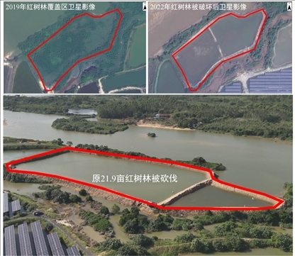 2023年11月23日,督察組現(xiàn)場督察使用無人機拍攝,儋州市光村鎮(zhèn)位于生態(tài)保護紅線內(nèi)21.9畝紅樹林被陸續(xù)砍伐。(督察組供圖)