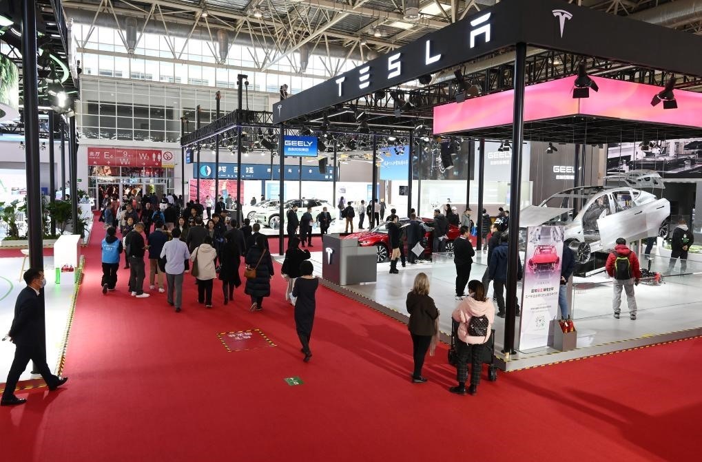 11月30日在鏈博會(huì)智能汽車(chē)鏈展區(qū)拍攝的特斯拉展位。新華社記者 任超 攝