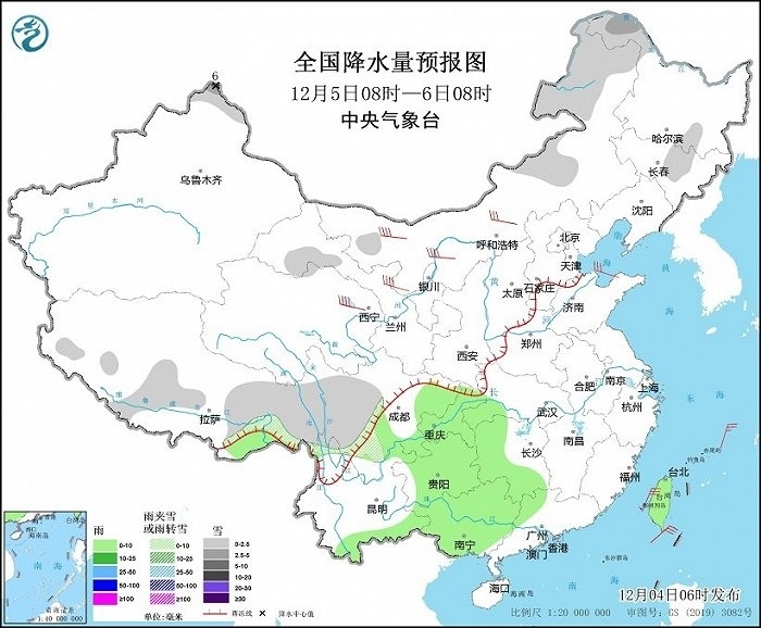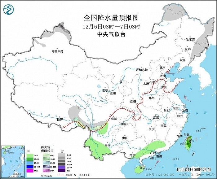 12月4日08時(shí)至5日08時(shí),新疆北部、甘肅河西、青海南部、西藏中東部和南部、川西高原北部等地部分地區(qū)有小到中雪或雨夾雪,其中,新疆阿勒泰山區(qū)和伊犁河谷、西藏南部等地部分地區(qū)有大到暴雪,局地大暴雪(20~22毫米)。湖南南部、江西南部、浙江大部、福建、廣東東部和北部、廣西西部、云南南部、海南島、臺(tái)灣島等地部分地區(qū)有小到中雨,其中,臺(tái)灣島中南部等地部分地區(qū)有大雨(25~40毫米)。新疆北疆北部、內(nèi)蒙古大部、甘肅河西等地部分地區(qū)有4~6級(jí)風(fēng)(見(jiàn)圖1)。