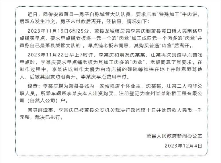 ·安徽蕭縣官方通報男子冒充城管要免費加肉:拘留10日。