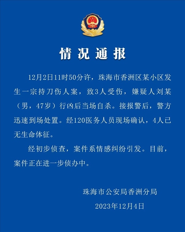 ·警方通報珠海一小區(qū)發(fā)生命案4人死亡:系情感糾紛引發(fā),男子致3死后自殺身亡。