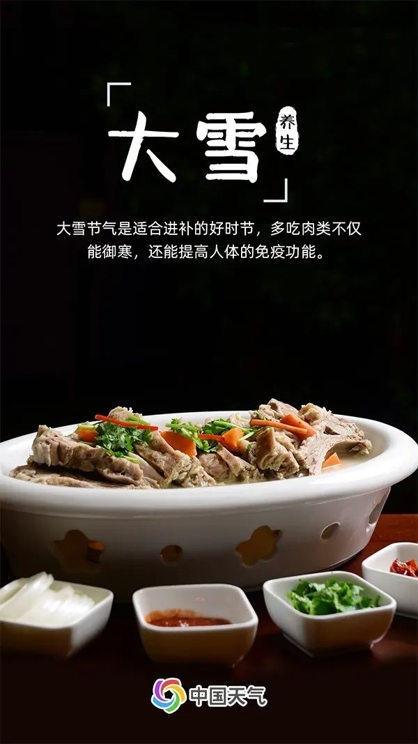 大雪也是適合進(jìn)補(bǔ)的好時(shí)節(jié)。冬天的寒冷為放肆吃肉提供了充足的理由,肉類(lèi)不僅能為我們的身體提供足夠的熱量以抵御嚴(yán)寒,還能提高人體的免疫功能,促進(jìn)新陳代謝。不過(guò),進(jìn)補(bǔ)也要有“度”,除了吃肉,也要適當(dāng)吃一些新鮮的水果和蔬菜,做到營(yíng)養(yǎng)均衡。