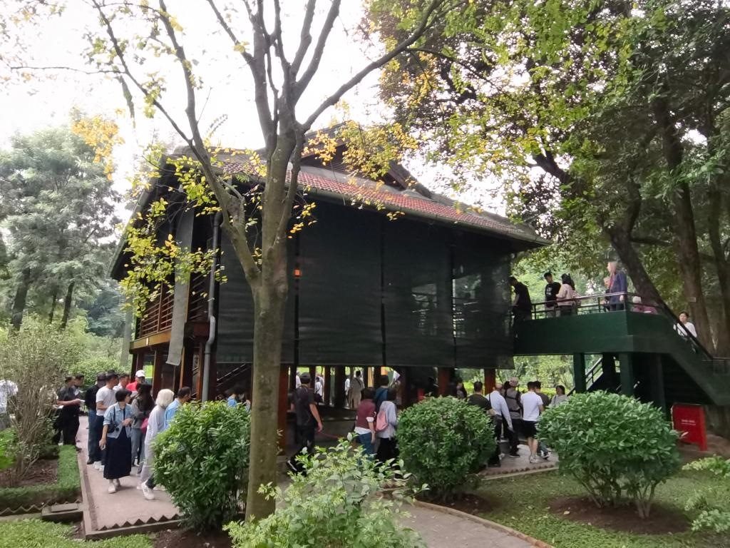 在河內(nèi)地標巴亭廣場一側,坐落著胡志明陵和胡志明故居。記者抵達廣場時,守衛(wèi)胡志明陵的儀仗兵正在舉行換崗儀式,眾多民眾和游客高舉相機或手機,記錄下這莊嚴肅穆的一刻。胡志明陵北側的胡志明故居內(nèi),各國游客排起長隊,在他曾長期居住和工作的高腳屋下駐足留影。