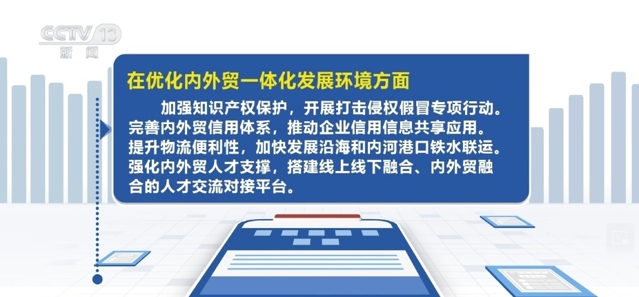 在優(yōu)化內(nèi)外貿(mào)一體化發(fā)展環(huán)境方面,加強知識產(chǎn)權(quán)保護(hù),開展打擊侵權(quán)假冒專項行動。完善內(nèi)外貿(mào)信用體系,推動企業(yè)信用信息共享應(yīng)用。提升物流便利性,加快發(fā)展沿海和內(nèi)河港口鐵水聯(lián)運。強化內(nèi)外貿(mào)人才支撐,搭建線上線下融合、內(nèi)外貿(mào)融合的人才交流對接平臺。