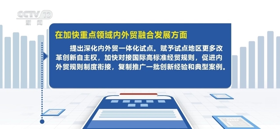 在加快重點領(lǐng)域內(nèi)外貿(mào)融合發(fā)展方面,提出深化內(nèi)外貿(mào)一體化試點。賦予試點地區(qū)更多改革創(chuàng)新自主權(quán),加快對接國際高標(biāo)準(zhǔn)經(jīng)貿(mào)規(guī)則,促進(jìn)內(nèi)外貿(mào)規(guī)則制度銜接,復(fù)制推廣一批創(chuàng)新經(jīng)驗和典型案例。