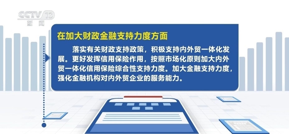 在加大財政金融支持力度方面,落實有關(guān)財政支持政策,積極支持內(nèi)外貿(mào)一體化發(fā)展。更好發(fā)揮信用保險作用,按照市場化原則加大內(nèi)外貿(mào)一體化信用保險綜合性支持力度。加大金融支持力度,強化金融機(jī)構(gòu)對內(nèi)外貿(mào)企業(yè)的服務(wù)能力。
