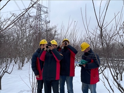 國網山西超高壓輸電公司工作人員在雪地中開展防覆冰特巡工作。新華社記者王怡靜 攝