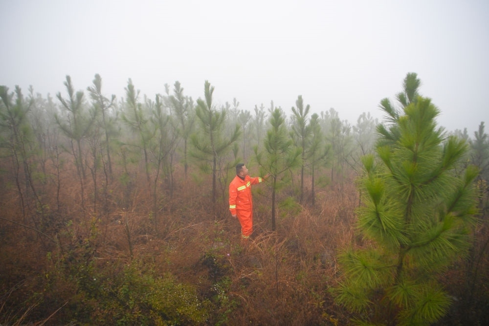 12月12日,護(hù)林員在河南省南陽市淅川縣馬蹬鎮(zhèn)葛家溝國儲(chǔ)林基地巡護(hù)。新華社記者郝源 攝