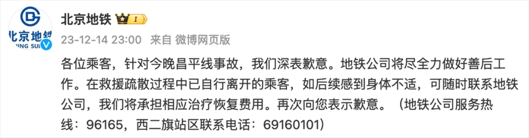 ·12月14日晚,北京地鐵昌平線(xiàn)事故導(dǎo)致30余人受傷,無(wú)人員死亡。北京地鐵發(fā)布微博致歉:將承擔(dān)相應(yīng)治療恢復(fù)費(fèi)用。