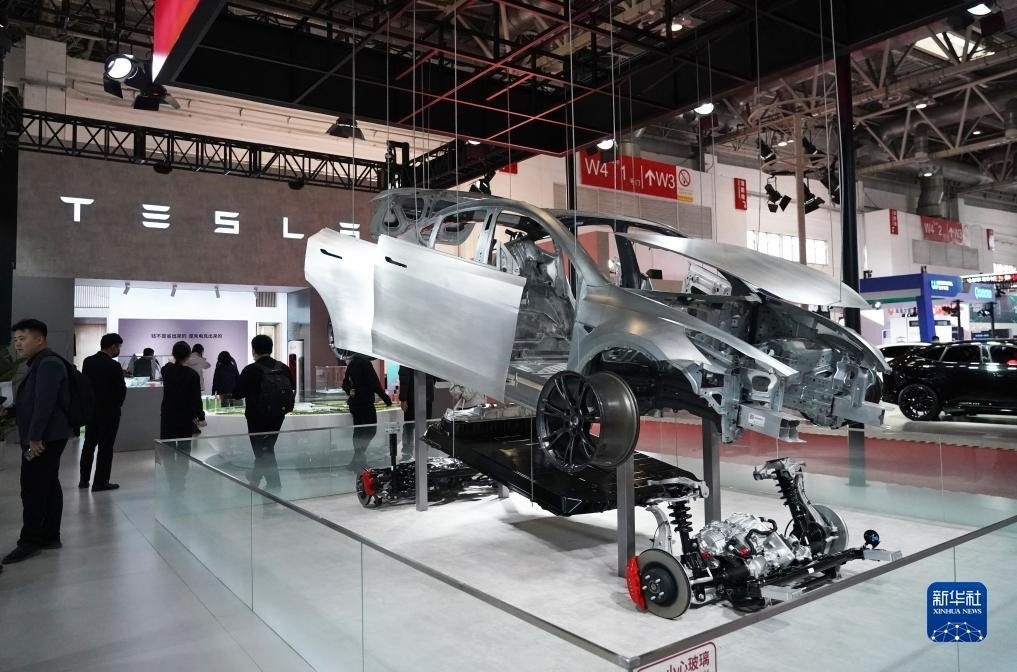 這是首屆中國國際供應(yīng)鏈促進博覽會智能汽車鏈展區(qū)的特斯拉展位(2023年11月30日攝)。新華社記者 任超 攝