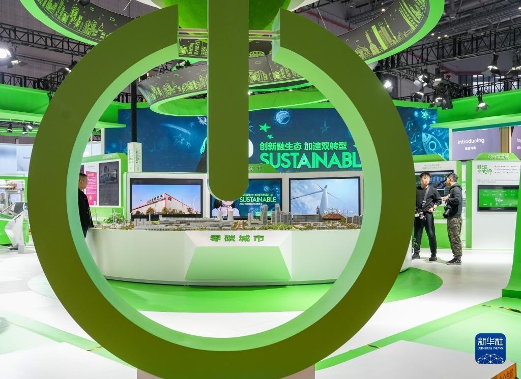 這是第六屆中國國際進口博覽會施耐德電氣展臺展出的“零碳城市”愿景模型(2023年11月9日攝)。新華社記者 丁汀 攝