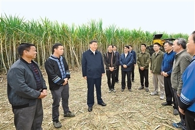 14日下午,習(xí)近平到來賓市考察調(diào)研。在國家現(xiàn)代農(nóng)業(yè)產(chǎn)業(yè)園黃安優(yōu)質(zhì)“雙高”糖料蔗基地,習(xí)近平察看萬畝甘蔗林和機械化作業(yè)收割場景,聽取基地情況介紹。他走進甘蔗林,詳細了解甘蔗良種繁育技術(shù)要領(lǐng),同蔗農(nóng)、農(nóng)機手和農(nóng)技人員親切交流。習(xí)近平指出,廣西是我國蔗糖主產(chǎn)區(qū),要把這一特色優(yōu)勢產(chǎn)業(yè)做強做大,為保障國家糖業(yè)安全、促進蔗農(nóng)增收致富發(fā)揮更大作用。要積極培育和推廣良種、提高機械化作業(yè)水平,建設(shè)好現(xiàn)代農(nóng)業(yè)產(chǎn)業(yè)園。要探索建立更加穩(wěn)定的利益聯(lián)結(jié)機制,讓廣大農(nóng)民共享農(nóng)村改革和發(fā)展成果。他祝愿鄉(xiāng)親們的生活像甘蔗一樣甜蜜。