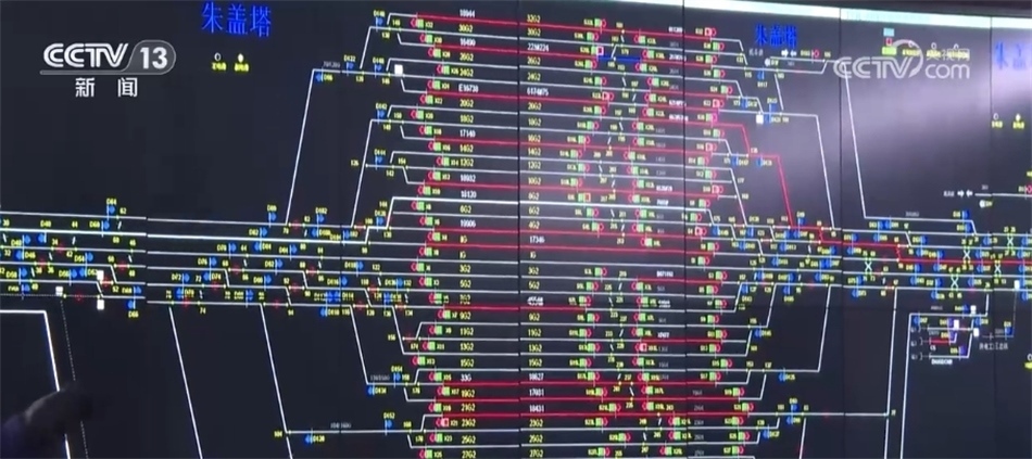 總臺(tái)央視記者 張叢婧:我現(xiàn)在是來(lái)到了車站的行車指揮室,可以看到這塊大屏幕上實(shí)時(shí)顯示著車站的列車狀態(tài),中間這些紅色的線就代表著此時(shí)軌道上正在有列車作業(yè)或者等待作業(yè),左邊這些紅色線就意味著現(xiàn)在有列車正在進(jìn)站。