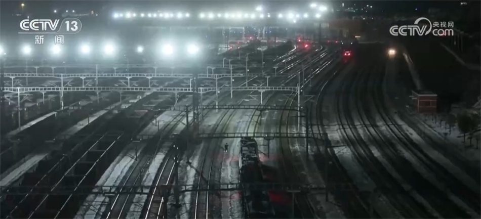 總臺(tái)央視記者 張叢婧:我現(xiàn)在是在一列滿載著將近一萬(wàn)噸煤炭的貨運(yùn)火車上,正在駛往黃驊港方向。這列車從神東礦區(qū)裝滿煤之后,一路往東,現(xiàn)在到達(dá)了它途中的第一個(gè)編組站,在這里會(huì)進(jìn)行更換車頭的工作,因?yàn)檫@往后的路會(huì)更加崎嶇難走,我們可以看到現(xiàn)在路上是有積雪,所以需要在這換一個(gè)更大功率的車頭,才能夠帶得動(dòng)它身后這一百多節(jié)車廂去走這段更艱難的路。現(xiàn)在隨著這個(gè)車緩緩進(jìn)站,馬上就要去進(jìn)行編組任務(wù)。