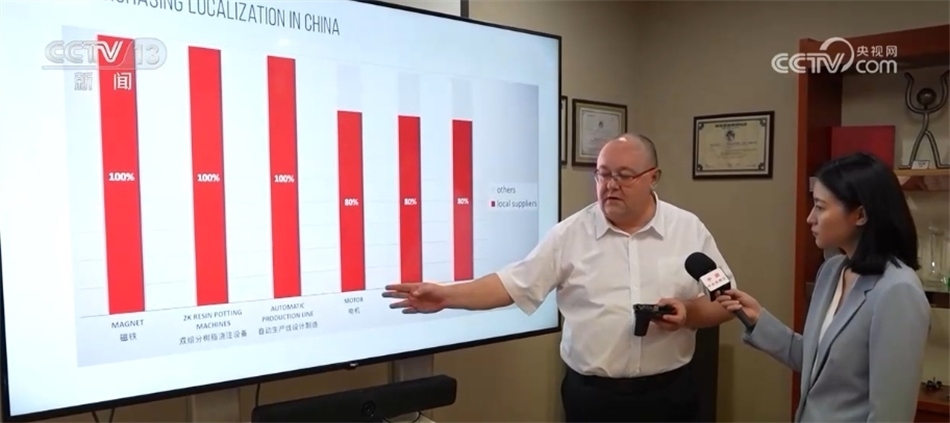 艾菲汽車零部件亞太區(qū)首席執(zhí)行官 埃里克·勒邁爾:從這張圖表中可以看出,就電機(jī)而言,我們使用的電機(jī)有80%來自當(dāng)?shù)毓?yīng)商,磁鐵則100%來自當(dāng)?shù)毓?yīng)商,當(dāng)?shù)毓?yīng)商質(zhì)量好、價(jià)格低。