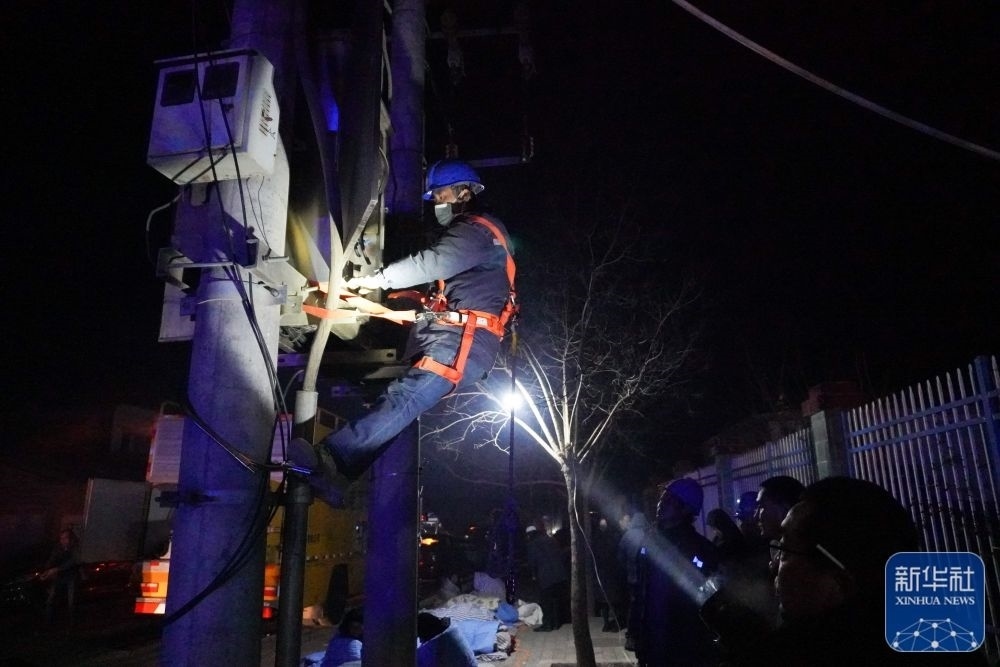 12月19日,在甘肅省臨夏回族自治州積石山保安族東鄉(xiāng)族撒拉族自治縣中西醫(yī)結合醫(yī)院門口,電力部門工作人員搶修電力設施。新華社記者 馬希平 攝