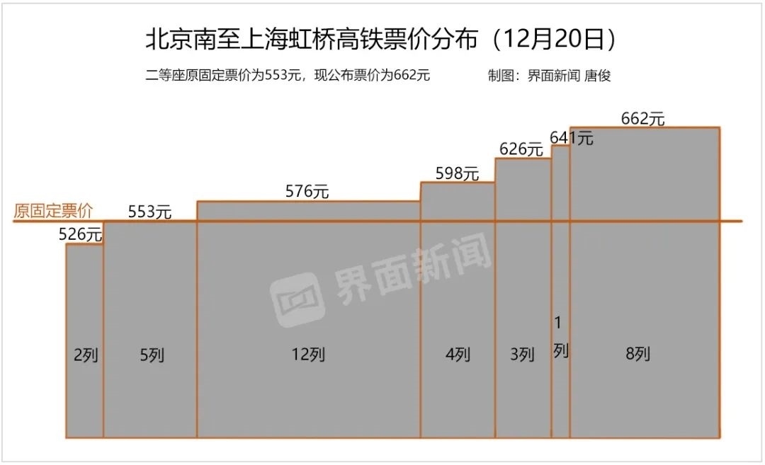 以京滬高鐵為例,此前全程二等座的固定票價(jià)為553元,現(xiàn)在的公布票價(jià)為662元。12月20日,北京南站至上海虹橋站開行35趟列車,其中只有2趟列車二等座票價(jià)低于553元,有5趟列車與原固定票價(jià)持平,其余80%列車高于原票價(jià)。漲價(jià)的列車中,8趟列車的實(shí)際票價(jià)與公布票價(jià)(662元)一致。