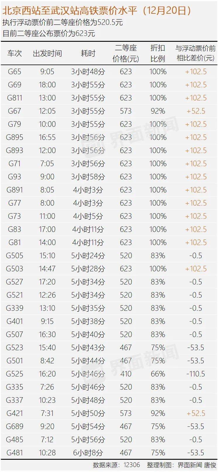 根據(jù)界面新聞統(tǒng)計(jì),12月20日,北京西站至武漢站共有30趟高鐵開行,其中16趟列車與原來相比票價(jià)上漲,14趟列車票價(jià)下降。票價(jià)上漲的列車中,大部分按照最高的公布票價(jià)定價(jià),相當(dāng)于上漲了102.5元;票價(jià)下降的列車中,只有少數(shù)列車降低了50多元。